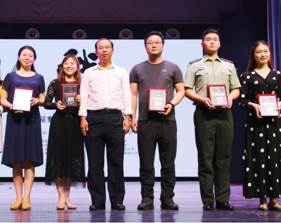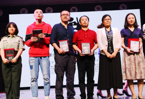 胡浩和邵鹏二位导演喜获“优秀指导教师”上台领奖的照片(左三和左四)