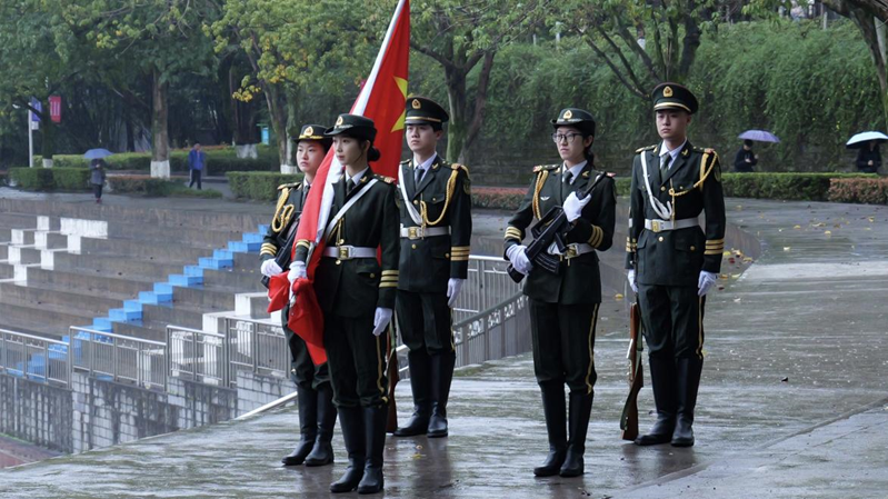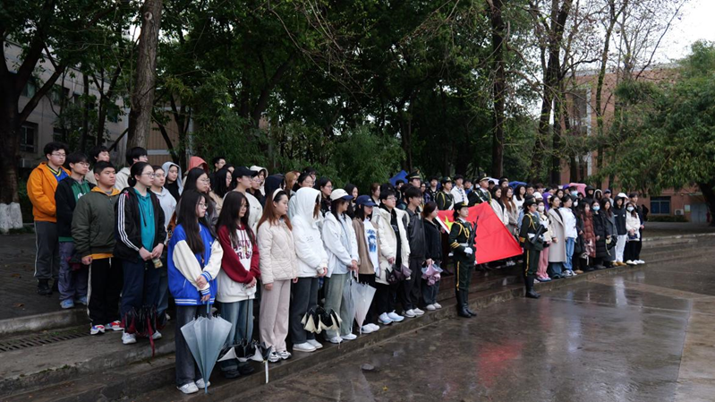 扬雄风、挺傲骨,步履铿锵;升国旗、奏国歌,气势昂扬。7时30分,活动在庄严的出旗仪式中拉开序幕,国旗班精神抖擞、步伐整齐。伴随着雄壮嘹亮的国歌,鲜艳的五星红旗冉冉升起,师生们在小雨中肃穆而立,用庄重的注目礼表达对伟大祖国的崇高敬意。