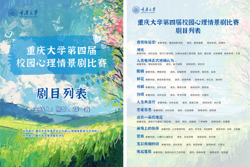 第四届校园心理情景剧比赛。比赛吸引了来自本科生院、博雅学院、电气工程学院、小橘灯心理协会等9个学院(社团)的学生团队报名参加,经过意向征集和剧本审核,共14个剧目进入线下展演。