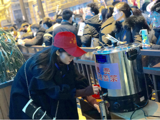 “音为爱国”志愿者协会社长苏子勰说,洪崖洞、长江索道、两江游、解放碑等地均有音为爱国志愿者协会的志愿者。他们分为四个小组,从晚上9点开始,一直跟随央视记者直播,维护现场秩序。”在长江索道景点,志愿者们提前准备好姜茶,免费送到现场游客手中,一杯杯热腾腾的姜茶,驱散了冬日的寒意。从千厮门大桥到洪崖洞,再到长江索道,最后在解放碑汇合, 17名大学生志愿者坚守到凌晨12点,等到市民和游客渐渐散去,他们才回家休息。