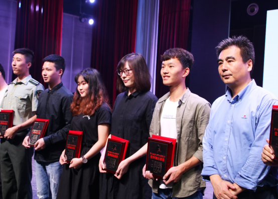 胡浩和邵鹏二位导演喜获“优秀指导教师”上台领奖的照片(左三和左四)