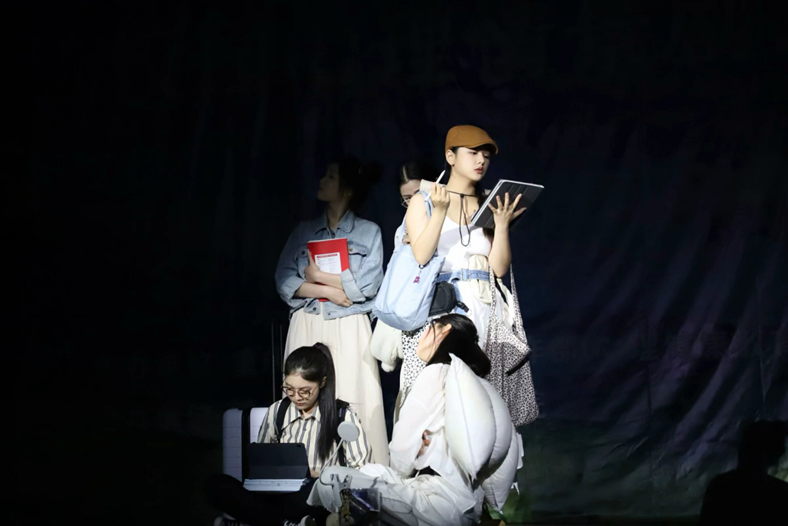2023级播音与主持艺术专业的黄圣植等同学带来的原创剧目《我恨拖延症》则展现了当代大学生的心理状态。交作业的截止时间即将到来,主角邹同学一拖再拖,刷视频、打游戏、立flag(目标)......在拖延中,他对一切与学习无关的事物都感兴趣,与两位扮演内心世界的同学展开了激烈的“斗争”,最终错过作业提交时间,懊悔不已。三位同学的演绎生动活泼,与台下的同学们产生了诸多共鸣,现场掌声不断,该剧目最终取得总分第五名的成绩。