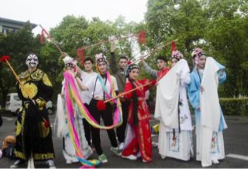 学生身着川剧服装,戴各色脸谱将中国戏曲的虚实相生、遗形写意之美展现地淋漓尽致。